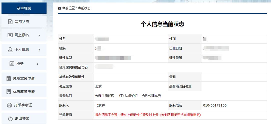 报名信息提交完成,系统会自动进入报考人员的个人后台页面,用于报考人员检查修改报考信息的内容。