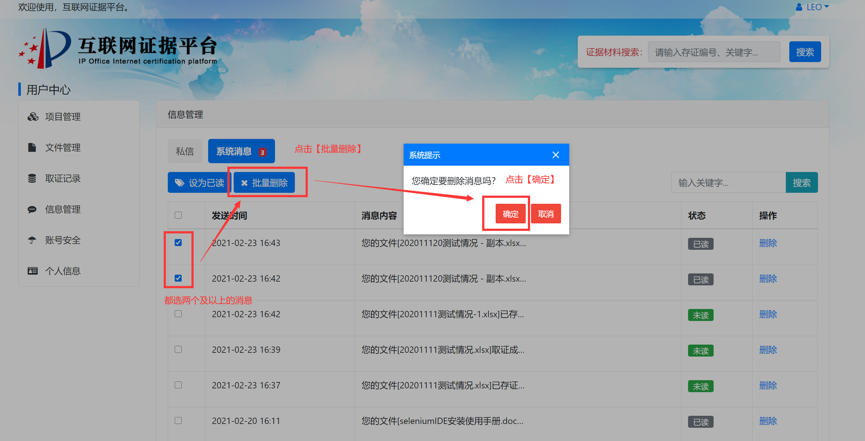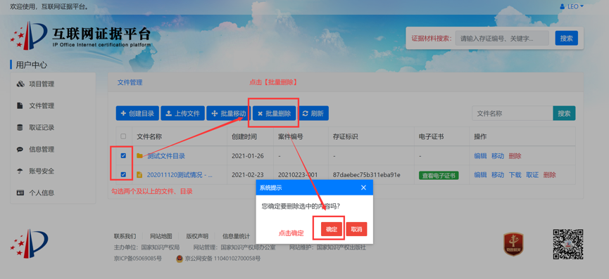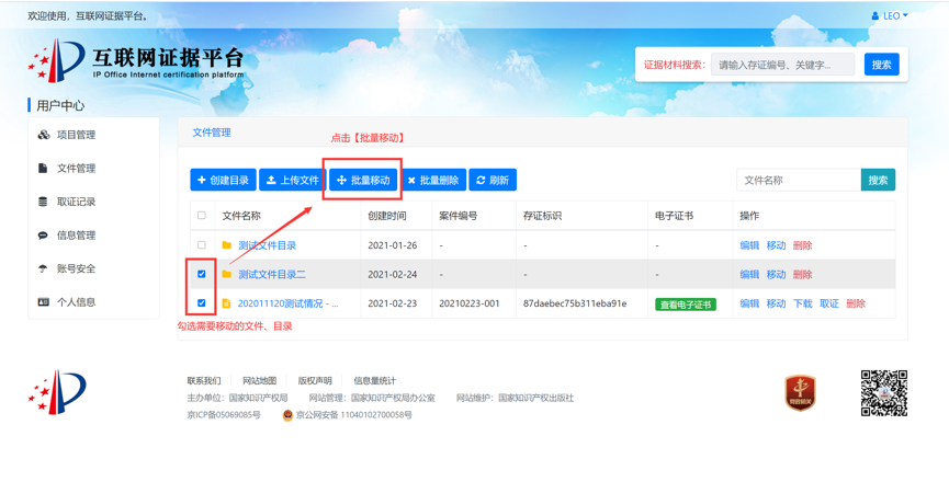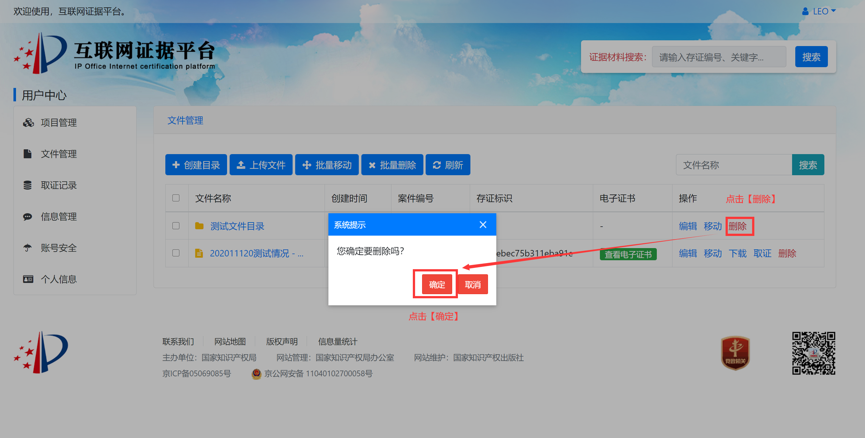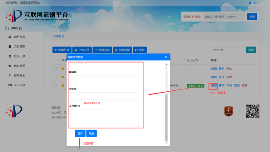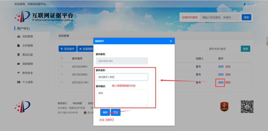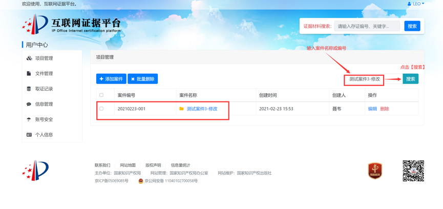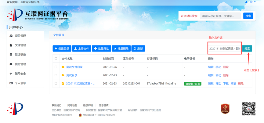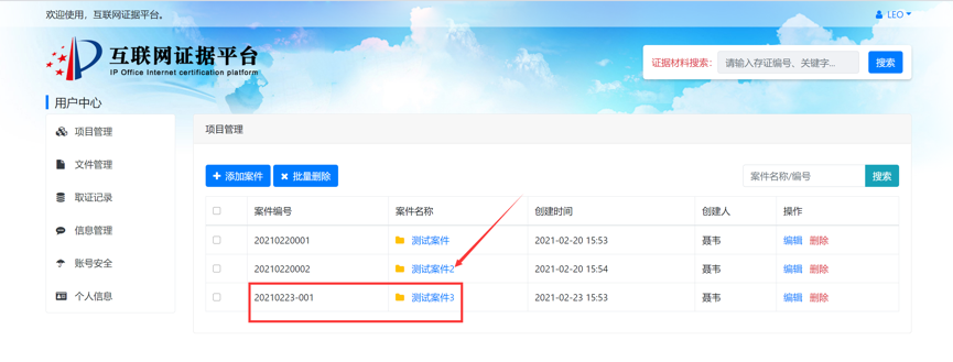 案件当事人可以根据需要将证据获取过程的录屏文件、证据文件等通过电脑客户端或网页端进行上传存证,并将已存证文件与案件编号进行关联。例如,针对某专利号为专利号2018300012345的无效效宣告案件(案件编号6W123456),当事人可提供在先公开的证据文件,并在案件管理或文件管理的界面中,填写该专利号2018300012345、案件编号6W123456后,上传该证据文件。