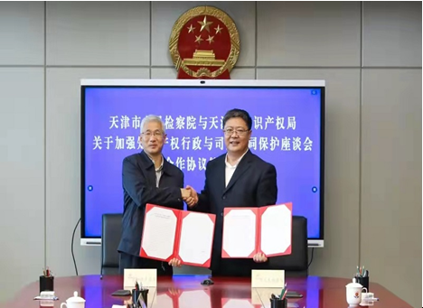 2022年全国知识产权宣传周期间,天津市知识产权局与市人民检察院共同签署《关于加强知识产权保护合作框架协议》和《关于建立行政机关专业人员兼任特邀检察官助力工作合作协议》,就加强知识产权行政和司法协同保护进行深入合作,进一步打通全市知识产权全链条保护。天津市人民检察院党组成员、副检察长刘博法,天津市知识产权局党组书记、局长吴挺签署协议。